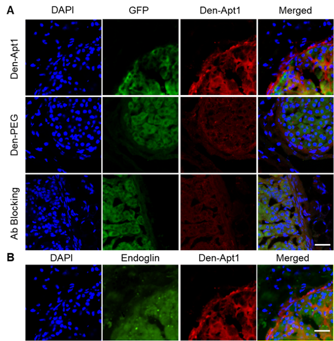 图3. 免疫荧光切片证实,探针(红色)聚集在原发性肝肿瘤模型的边缘区域。它和endoglin受体(B图绿色)的共定位证实了探针的靶向性。