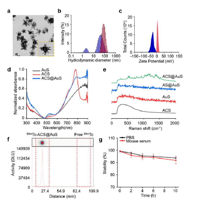 图2. 探针99mTc-ACS@AuS的表征。(a)ACS@AuS的TEM图。(b)AuS(蓝色)和ACS@AuS(红色)的水合粒径图。(c)AuS(蓝色)和ACS@AuS(红色)的Zeta电势。(d)AuS、ACS和ACS@AuS的紫外吸收光谱。(e)ACS、AuS、AS@AuS和ACS@AuS拉曼光谱。(f)99mTc-ACS@AuS的放射化学纯度大于99%。(g)99mTc-ACS@AuS在PBS(pH7.4)和小鼠血清中的放射化学稳定性。