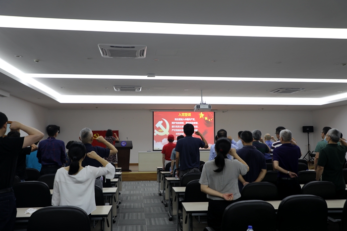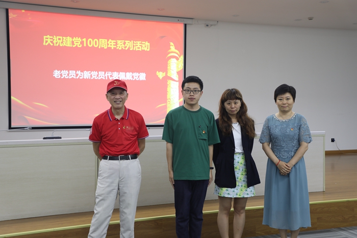 随后,由老党员代表陈纪岳同志、党委组织委员王洋为为新近加入中国共产党的新党员代表——学科科研办秘书朱东朔和2020级硕士研究生曹浩佩戴党徽。在史雪茹副书记的带领下,全体党员起立,面对鲜红的党旗,共同重温入党誓词:“我志愿加入中国共产党,拥护党的纲领,遵守党的章程,履行党员义务,执行党的决定,严守党的纪律,保守党的秘密,对党忠诚,积极工作,为共产主义奋斗终身,随时准备为党和人民牺牲一切,永不叛党。”
