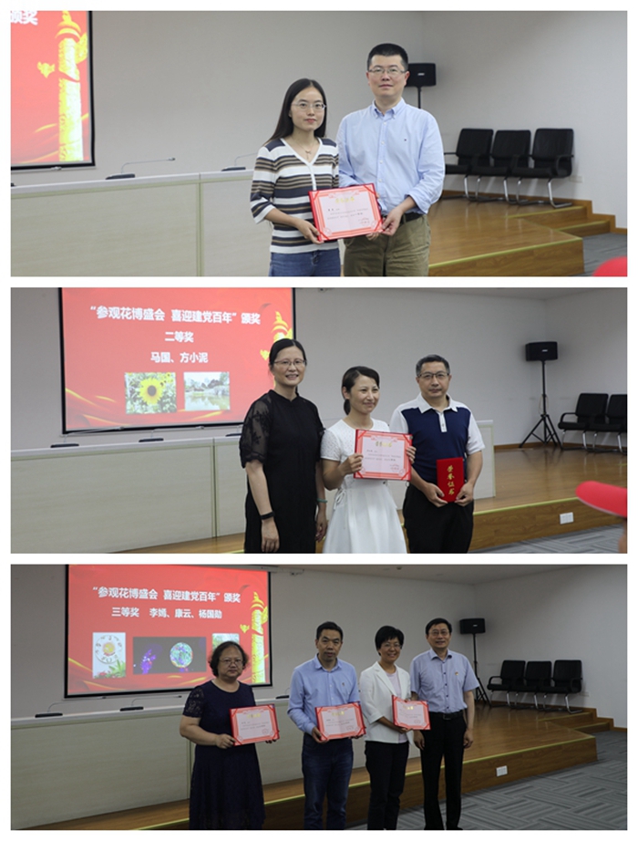 接下来,进行“参观花博盛会,喜迎建党百年”主题摄影比赛的颁奖仪式。6月25日,色情直播 工会组织60多名教职工游花博会,并举办主题摄影比赛,用镜头记录与建党相关的红色元素,以此来激励广大教职工学党史、跟党走。由李聪院长、潘俊常务副院长、陆伟跃教授分别为一等奖、二等奖、三等奖获奖教师颁发荣誉证书。
