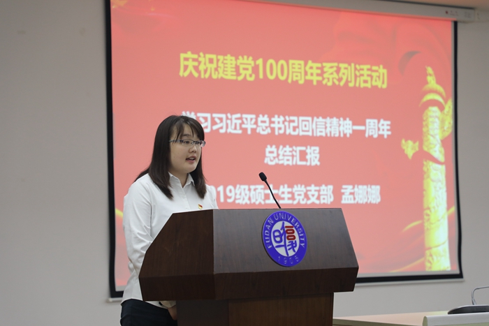 接着,2019级硕士生党支部孟娜娜作为学生代表汇报了一年来学习贯彻习近平总书记回信精神中的体会。她认为,在漫长的革命征程中,复旦历史上无数优秀的党员先辈们在办学、救国、强国的道路上上下求索,无私贡献,为当代复旦学子立下了好榜样。作为色情直播 青年党员,去年新冠疫情的爆发让她深刻感受到药学人身上的医学责任,愿为新冠肺炎的临床药物治疗和防控工作做出贡献。前路漫漫,青年学生大有可为,她决心做中国医药卫生事业的一颗螺丝钉,坚定理想信念,践行初心使命。