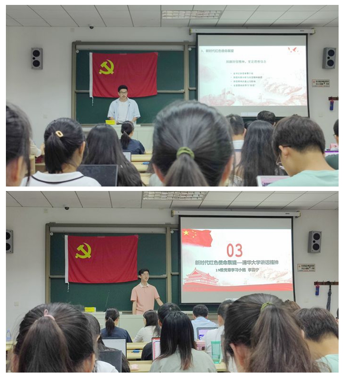 紧接着,为充分掌握新时代的新要求,20级党章学习小组陈政阳带领回顾习近平总书记回信精神,19级党章学习小组李嘉宁带领感悟习近平总书记在清华大学考察时的讲话精神,强调习近平总书记对于党史学习的总要求,以及对青年学生“立志成为德智体美劳全面发展的社会主义建设者和接班人”和“肩负历史使命,担当复兴大任”的殷切期盼。两位同学从自身感悟出发,结合实际,对于建党百年之际青年学生的个人标准以及今后发展方向提出自己的看法。