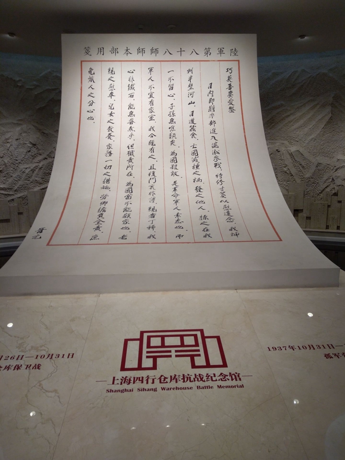 走进纪念馆,迎面正中展示的是四行仓库抗战指挥官谢晋元将军在赴淞沪战场前写给妻子的家书,展现了中国军人在国难当头之际舍小家为大家的家国情怀。读之令人动容:巧英吾妻爱鉴:日内即将率部进入沪淞参战,特修寸笺以慰远念。我神州半壁河山,日遭蚕食,亡国灭种之祸,发之他人,操之在我,一不留心,子孙无噍类矣。为国杀敌,是革命军人素志也;而军人不宜有家室,我今既有之,且复门哀祚薄,亲者丁稀,我心非铁石,能无眷然乎!但职责所在,为国当不能顾家也。老亲之慰奉,儿女之教养,家务一切之措施,劳卿担负全责,庶免旅人之分心也。