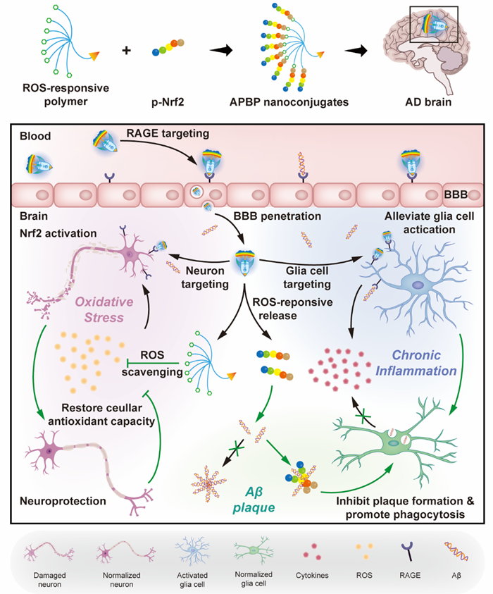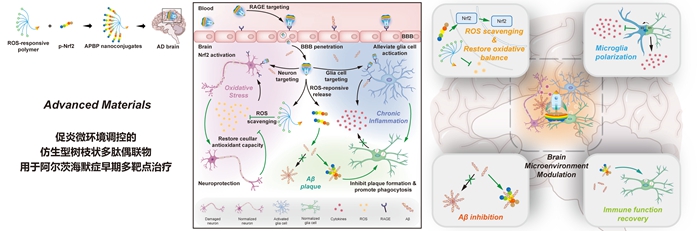 由于脑部疾病的复杂性,研究学者逐渐意识到脑部病灶区域的微环境改变对于脑部疾病治疗的重要意义。近些年来,促炎微环境在AD早期阶段的作用得到了越来越多的关注,其主要表现在氧化应激和胶质细胞激活两方面。一方面,小胶质细胞作为脑内固有的免疫细胞,对于维持脑内代谢和免疫平衡有着重要意义,可以作为促炎微环境调控的中心;另一方面,持续激活的胶质细胞导致大量的活性氧簇(ROS)产生,进一步诱导神经细胞凋亡。清除微环境中积累的ROS并激活神经细胞的抗氧化能力是一种可行的治疗手段。基于以上微环境特征,本研究设计并构建了一种能够模拟Aβ脑内转运的树枝状多肽纳米偶联物,以实现AD早期病灶微环境的多靶点调控(图1)。该纳米偶联物能够高效进入AD病灶,通过ROS敏感的聚合物材料清除微环境中的ROS。此外,偶联的多肽药物能够激活核因子E2相关因子2(Nrf2),进而重塑受损细胞的自身抗氧化能力。通过载体与多肽药物的联合作用,纳米偶联物能够从内而外缓解氧化应激、减轻胶质细胞激活、极化小胶质细胞M2转型并促进Aβ清除,最终实现微环境的正常化。研究人员在APP/PS1转基因小鼠体内验证了该多靶点治疗策略能够显著改善AD模型小鼠的认知功能,为AD治疗提供了新的思路。