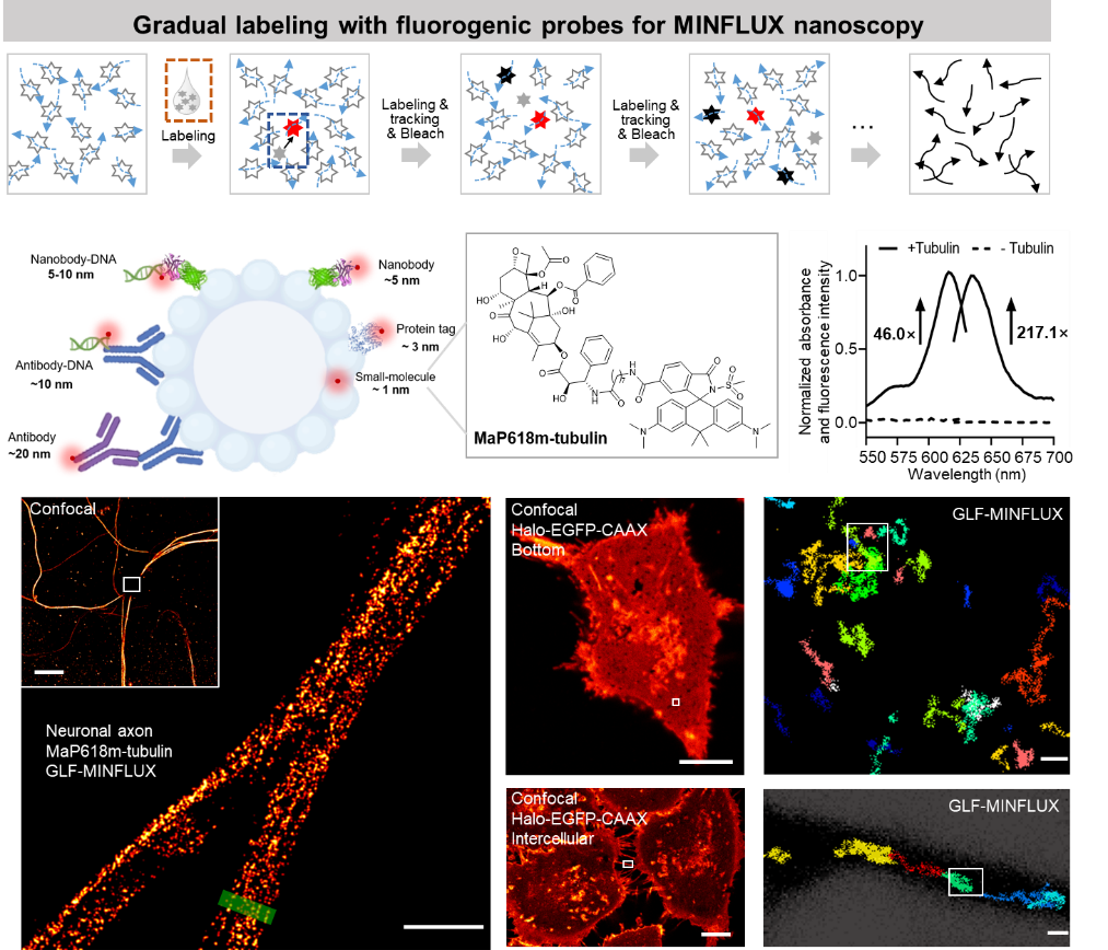 This method integrates MaP fluorogenic dyes derived from the chemotherapeutic drug paclitaxel with protein-activated fluorescence switching and a “label–locate–bleach” workflow to achieve dense and precise labeling of microtubule proteins and other drug targets in living cells. Compared to traditional MINFLUX, GLF-MINFLUX improves localization precision by 1.7-fold, imaging efficiency by 2.2-fold, and labeling density by 3-fold, achieving spatial resolution as fine as 2.6 nm for targets such as microtubules and mitochondrial TOM20.