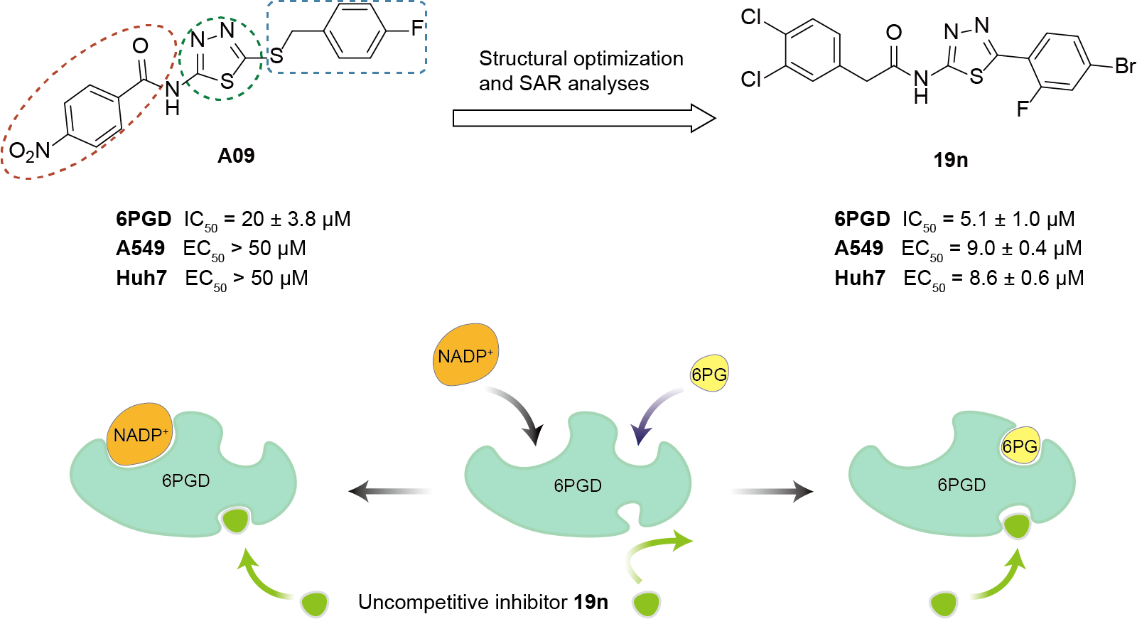 July 31, 2025—Prof. Lu Zhou’s lab from School of Pharmaceutical Sciences, Fudan University, collaborating with Prof. Changliang Shan’s group from Nankai University, reports the development of a novel series of uncompetitive inhibitors targeting 6-phosphogluconate dehydrogenase (6PGD), a key enzyme in tumor metabolism, for potential cancer therapeutics. This work has been published online in the Journal of Medicinal Chemistry entitled as “Discovery of N-(1,3,4-Thiadiazol-2-yl)amide Derivatives as Uncompetitive Inhibitors of 6-Phosphogluconate Dehydrogenase”.