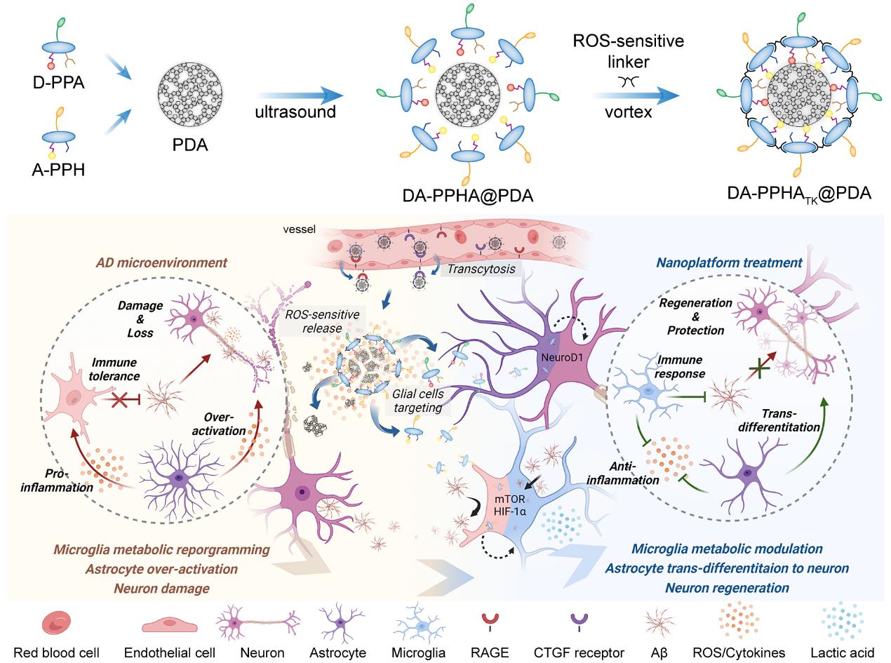 Therefore, in this study, Professor Jiang's team constructed a PDC co-delivery platform based on the previous research on PDC. First, two PDCs coupled with glial cell regulatory drugs were synthesized and loaded on the surface of polydopamine (PDA) nanoparticles by electrostatic adsorption and covalent cross-linking. After intravenous injection, the delivery platform crossed the BBB through transcytosis, dissociated and released the two PDC-targeted glial cells in the inflammatory microenvironment in the brain. Hydroxychloroquine (HCQ) was targeted to microglia to activate immune response and restore energy metabolism. All-trans retinoic acid (ATRA) was targeted to astrocytes to promote transdifferentiation and reduce inflammation. This study abandoned the traditional neuron-centered brain disease treatment strategy and demonstrated a new method for regulating dormant glial cells to treat AD. At the same time, this study provides a new approach for PDC targeted delivery, providing new ideas for the multi-target treatment of diseases. The research was published in the latest issue of Advanced Materials in a paper titled "A Peptide-Drug Conjugate-Based Nanoplatform for Immunometabolic Activation and In Situ Nerve Regeneration in Advanced-Stage Alzheimer's Disease".
