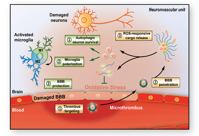 To solve the problems, the research group developed a micelle drug delivery system targeting to the microthrombus in the injured brain vasculature and encapsulated rapamycin to modulate the cellular stress pathway in order to achieve simultaneous modulation of multiple cell types in NVU (Figure 2). The micelles could bind to microthrombus and penetrate the impaired blood-brain barrier (BBB) into the ischemic lesion. Drug release could be triggered by the high level of reactive oxygen species (ROS) in the oxidative microenvironment, meanwhile effectively eliminate ROS; the released rapamycin could enhance the anti-stress autophagy and polarize microglia to the M2 repairing phenotype. By combining the functions of carriers and drugs, the polymeric micelles could achieve effective neuroprotection, microglia polarization and restoration of BBB function, thus remodeling the neurovascular unit to improve the microcirculatory perfusion and reduce brain infarction.