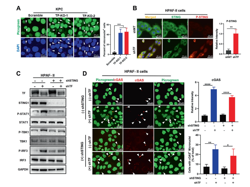 The study established the relationship between TF and cGAS-STING by analyzing the genomics and tissue microarrays of patients. In patients with TF-overexpression, the levels of STING signal activation markers P-STING/P-TBK1 were extremely low, as well as the levels of ISGs and immune effect cells were reduced. Furthermore, by constructing mouse and human pancreatic orthotopic tumor models, treatment of tumors with TF-KO/shRNA or anti-TF antibody HuSC1-39, significant anti-tumor effects were achieved and greatly promoted STING signal activation in the tumors.