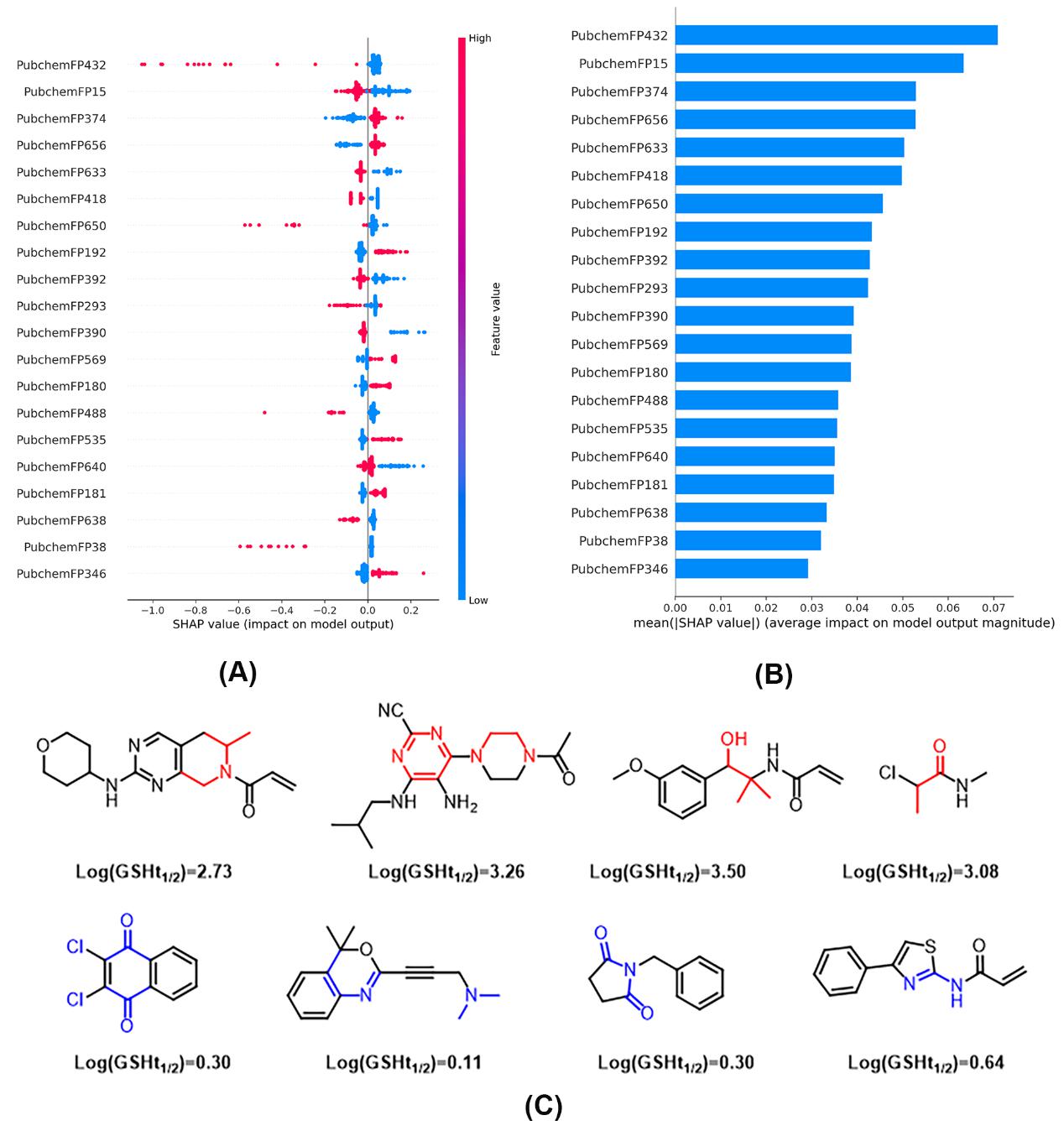 Figure 2. Results of the SHAP analysis of the model. The top 20 SHAP value distribution (A) and average (B) of all samples in the dataset, as well as compounds with representative substructure features (C). Red and blue features indicate weakening and strengthening of the compound's reactivity, respectively.