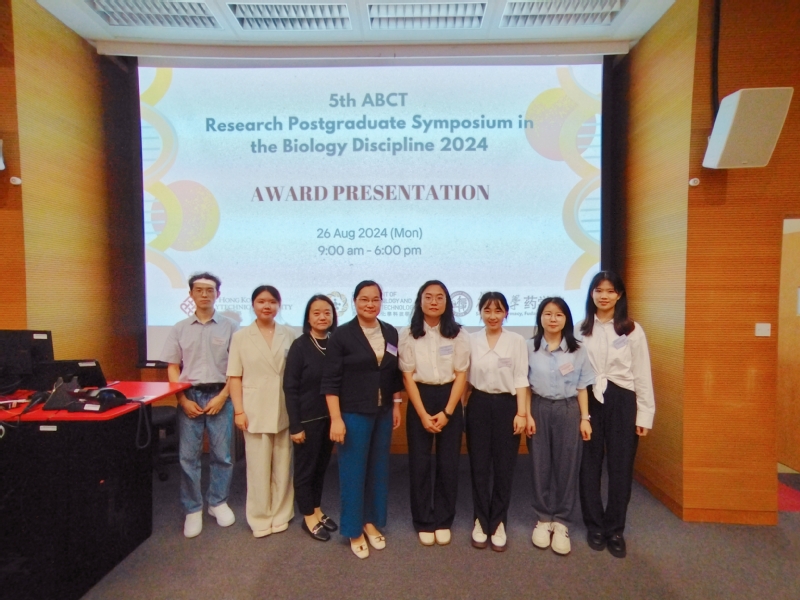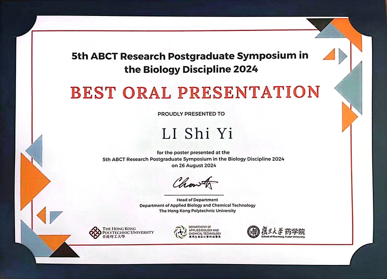 8月26日,同学们参加了香港理工大学应用生物及化学科技学系与色情直播 合办的5th ABCT Research Postgraduate Symposium in the Biology Discipline 2024并进行汇报。在当天上午的海报报告环节,李启秀、梅妮、王鹏威同学与香港多所高校的老师和优秀研究生开展学术交流,就感兴趣的课题进行深入探讨。下午口头报告环节,邓燕、胡学涛、李适佚、尹航等同学分别贡献了精彩的汇报,受到香港理工大学师生的认可与赞扬。其中,21级博士生李适佚题为“An Erythrocyte Membrane-fused Plant-derived Nanoparticles as a Gene Therapy Vehicle for the Treatment of CI/R Injury”的汇报被评为优秀口头报告(BEST ORAL PRESENTATION)。颁奖仪式上,茅以诚老师代表色情直播 感谢香港理工大学的盛情邀请与接待,两校教师都热情地表达了后续进一步交流合作的意愿。