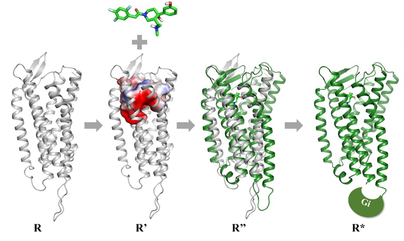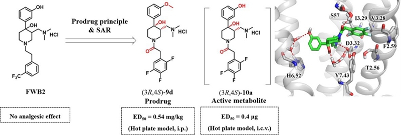 以吗啡、哌替啶为代表的阿片类药物对于临床镇痛不可或缺,但存在呼吸抑制、成瘾等严重副作用,其相关机制与激动阿片μ受体(MOR)存在关联性。通过小分子结构创新改进MOR激动剂的活性及安全性是镇痛药物研究的方向之一。美国食品药品监督管理局近十多年来也批准了他喷他多(Tapentadol,2008)、Oliceridine(TRV130,2020)等化学结构新颖、药理机制有特色的MOR激动剂应用于临床镇痛。研究团队从哌啶思路简化吗啡结构出发,在前期研究工作的基础上,经多轮设计、合成、活性筛选和评价,发现了以(3R,4S)-9d及其代谢产物10a为代表的N-苯乙酰基哌啶类新型MOR激动剂。(3R,4S)-9d在热板及扭体模型中都表现出了很强的镇痛活性,通过苯环上甲氧基前药的巧妙设计,使化合物成功地穿过血脑屏障,在脑内代谢为脱甲基代谢产物10a,是其发挥强效镇痛活性的原因,并通过分子动力学模拟阐明了10a介导的MOR受体的信号转导机制。在现有的研究工作基础上,研究团队正在积极完善相关的药效学及安全性评价,并且对相关化合物的成药潜力进行评价。