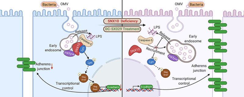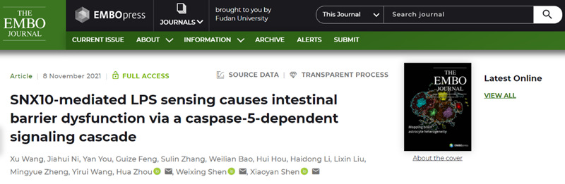 2021年11月8日,色情直播 沈晓燕课题组联合南京中医药大学沈卫星课题组,以及澳门科技大学周华研究团队,在The EMBO Journal期刊在线发表了标题为SNX10-mediated LPS sensing causes intestinal barrier dysfunction via a caspase-5-dependent signaling cascade的研究成果。研究揭示OMV通过内化的方式进入人肠上皮细胞中的早期内体中,进而诱导SNX10介导的caspase-5和PIKfyve在早期内体膜上的募集,随后触发LPS释放到细胞质中,并被caspase-5感知。激活的caspase-5引起Lyn磷酸化,诱导Snail/Slug的核转位,并导致E-cadherin下调,最终破坏肠上皮屏障功能。该研究发现了一个新的信号轴,其中支架蛋白SNX10提供了一个平台,用于整合LPS释放、感知和信号转导的分子机器的组装和定位。该研究揭示了IBD肠上皮屏障功能障碍新分子机制,为IBD的预防和治疗提供了药物靶标。