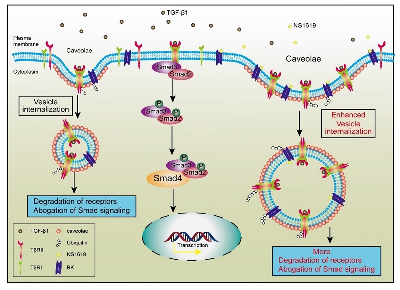 张雪梅教授课题组研究发现,BK基因缺失导致的差异基因在细胞外基质通路显著富集。敲除BK通道基因在小鼠肾脏纤维化模型中能够促进TGF-β1/smad信号通路的进一步激活,并加重肾脏纤维化;而激活BK通道可显著抑制TGF-β1/smad信号通路,并缓解小鼠肾脏纤维化疾病的进程。进一步研究发现,BK通道开放可促进转化生长因子β(TGF-β)受体降解,该作用与促进TGF-β受体在胞膜小窝富集相关。BK通道可通过调控胞膜小窝介导的TGF-β受体内吞促进TGF-β1/smad信号通路的降解,进而产生抗纤维化作用。