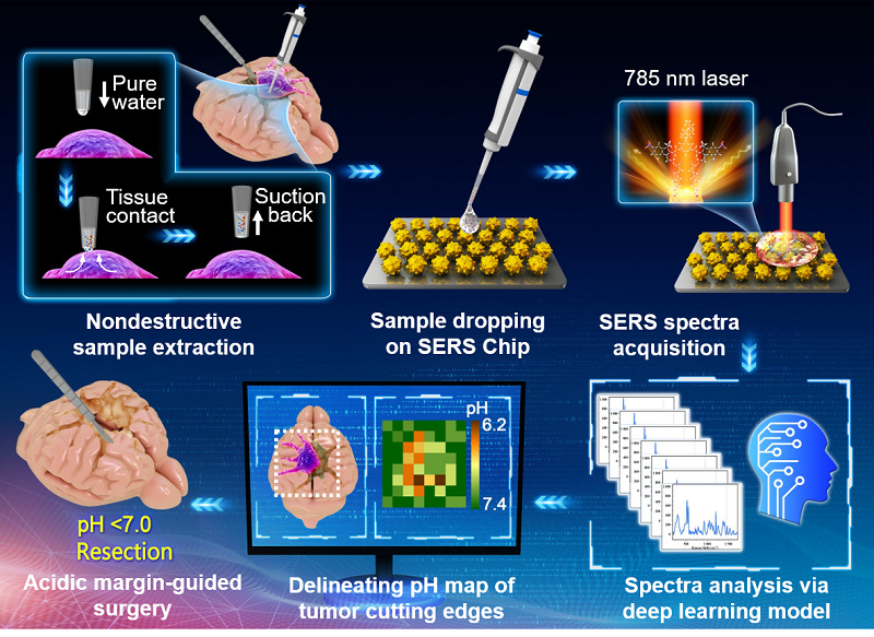 近日,色情直播 李聪教授、类脑智能科学与技术研究院张孝勇研究员、信息科学与技术色情直播 余锦华教授以及附属华山医院神经外科毛颖教授联合研究团队构建了一类基于表面增强拉曼散射(SERS)技术的胶质瘤手术导航原理验证系统。该系统由自主研制的pH响应SERS芯片,手持式拉曼光谱仪以及拉曼光谱深度学习系统组成。该工作提出了水滴辅助组织取样技术,能够将手术切面可疑组织表面代谢物无损地转移到SERS芯片上。还提出了报告分子诱导表面增强拉曼共振效应新原理。实现了微量液滴样本pH值的快速测定。自主构建的深度学习模型自动分析样本拉曼光谱并准确、快速地测定样品pH值。该智能SERS系统导航可在6分钟内对64个组织位点(约1cm2)pH进行测量,并通过绘制组织pH分布图定位“酸性代谢边界”。与临床手术导航技术相比,基于“酸化边界”的手术导航策略显著提高大鼠胶质瘤模型存活率,延缓了肿瘤复发速度。此外,通过5例病人胶质瘤组织样本分析,也发现了酸化与恶性程度之间的相关性,揭示了“代谢边界”手术导航策略临床转化的可行性。