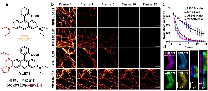 荧光成像显微镜是生命科学和医药学研究的基本工具。超分辨显微成像技术,如受激辐射损耗(STED)显微术,突破传统显微镜200纳米分辨率极限,可在数十甚至数纳米尺度观测细胞微观结构,为疾病中蛋白功能研究、靶标蛋白追踪和药物开发等领域提供了新的机遇。如何同时提升荧光染料的多个性能(亮度、光稳定性等),构建新一代探针是STED超分辨成像领域亟需解决的问题。