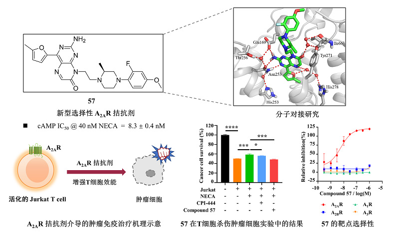 新型蝶啶酮类A2AR小分子拮抗剂化合物57的化学结构、对接模型、活性与选择性及其增强T细胞活化和肿瘤细胞杀伤活性的作用