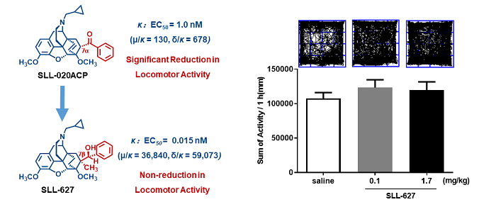 研究团队选择成药性优良、前期工作扎实的吗啡喃类为研究骨架,在对kappa受体激动剂进行系统探索、构效关系分析及药理学评价的基础上,设计并合成了一系列7α-甲基-7β-芳基奥维醇及奈培酮类似物,通过体外筛选及体内药理活性评价发现了强效高选择性kappa受体激动剂SLL-627。