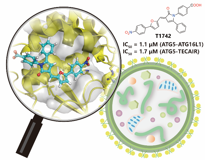 作者首先基于虚拟筛选发现了一种具有3-[(E)-呋喃-2-基甲亚基]-1H-吡咯-2-酮骨架的化合物T1742,该化合物在体外HTRF结合实验中可以阻断ATG5-ATG16L1和ATG5-TECAIR相互作用(IC50=1~2 μM),并在细胞流式和免疫印迹实验中也表现出对自噬的抑制效果。作者通过分子动力学模拟预测了T1742与ATG5可能的结合模式,并以此为指导合成了一批具有相同结构骨架的衍生物。这些新合成的化合物其靶蛋白亲合性实验结果和细胞流式实验的结果大体一致,证明了活性化合物的作用机制。该项研究工作在国际上首次获得了活性达到微摩尔级别的ATG5蛋白小分子抑制剂,证实了ATG5蛋白小分子抑制剂可以作为一类新的自噬抑制剂工具分子来探索自噬机制,也具备进一步发展成为候选药物的潜力。