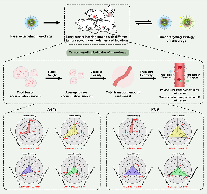 基于以上问题,该研究以高发病率、高死亡率的肺癌为研究对象,以肿瘤的生长速度、体积和位置差异为主要分析因素,聚焦于 EPR 效应所描述的血-肿瘤转运过程,探索了不同生长特性肿瘤的血管生理特征及其对纳米药物靶向行为的影响,并在不同小鼠肺癌模型中进行了纳米药物靶向策略对比和体内药效验证(图1)。