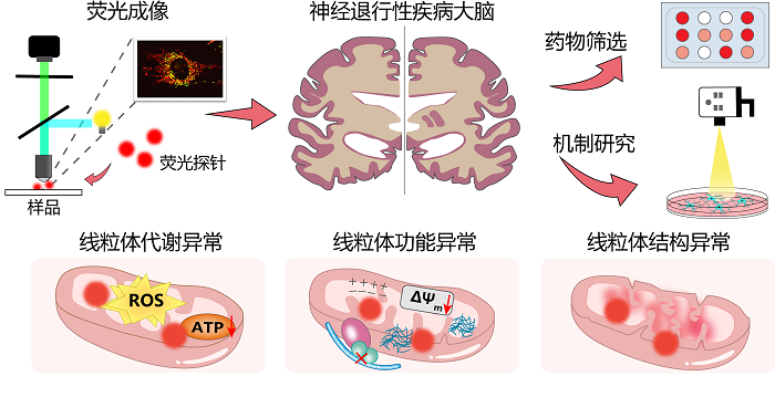 随着全球人口老龄化日益加重,神经退行性疾病(ND)的发病率和死亡率迅速增加。帕金森病(PD)、阿尔茨海默病(AD)、亨廷顿舞蹈病(HD)等神经退行性疾病的共同病理表现为毒蛋白蓄积造成的神经元损伤。基于不断增长的临床需求,对神经元线粒体的动态监测技术已成为ND药物研发的急迫需求。线粒体功能障碍在ND发生、发展过程中发挥了重要作用。原发性线粒体异常出现在毒蛋白蓄积和疾病临床症状之前。随着ND进展,毒蛋白逐渐沉积并诱发继发性线粒体功能障碍,例如酶活性受损和线粒体蛋白质稳态改变。在ND后期阶段,线粒体损伤加剧,严重的线粒体功能障碍会导致神经元死亡并造成认知损伤。因此,可视化神经元线粒体状态对于监测ND进程和评估候选药物疗效均具有重要作用。荧光显微成像具有灵敏度高、操作简单、时空分辨率高等诸多优势,已广泛应用于线粒体功能研究。由探针和显微镜构成的荧光成像平台通过动态监测线粒体形态、功能变化,为ND的精确诊断和候选药物疗效评估提供新工具。