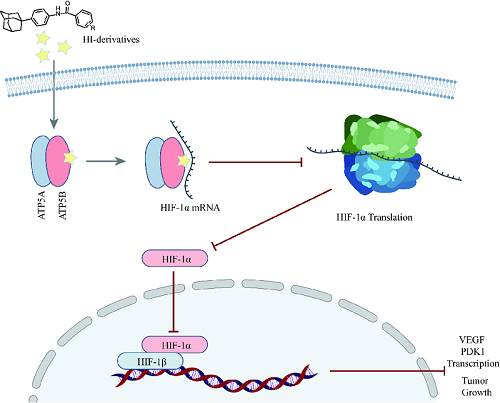 周璐教授团队利用构建的新型双荧光素酶活性测定体系进行基于表型的高通量筛选,得到了一类抑制HIF-1α转录活性的金刚烷苯胺类化合物。通过结构优化和化学合成,获得了活性高、毒性小的探针分子HI-102;利用探针分子通过基于亲和力的蛋白质组分析技术(affinity-based protein profiling,ABPP)识别并确认其作用靶点为ATP合酶的β亚基(ATP5B);借助敲低、敲入、荧光偏振、免疫荧光等方法进行了靶点验证和作用机制研究,揭示了该类化合物通过以ATP合酶非活性依赖的方式促进亚基ATP5B与HIF-1α的mRNA的结合,进而抑制HIF-1α翻译和转录活性,最终抑制肿瘤的生长。