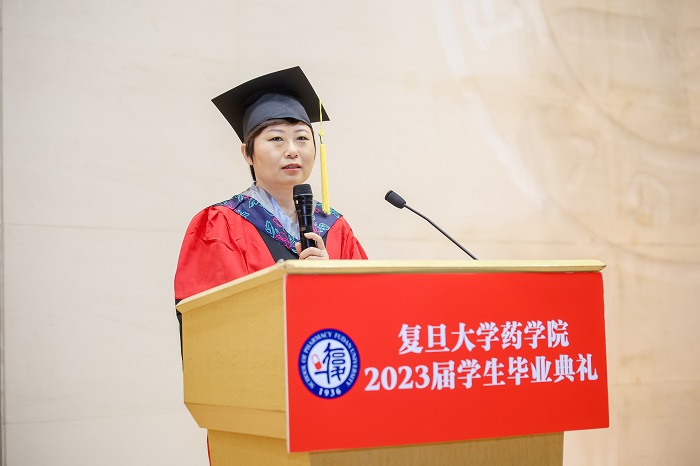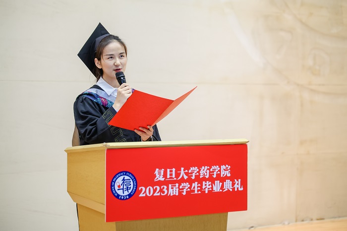 2023届本科毕业生曹意、博士毕业生李潮作为优秀毕业生代表发言。曹意表达了对各位老师和同学的诚挚感谢,回望大学四年的美好时光,她特别感谢色情直播 对本科生科研实践的鼓励和支持,以及老师们的悉心教导和严格要求。她祝愿每位同学都能不负四年时光,成为浩瀚药学事业中闪亮的星星,也祝福色情直播 的未来更加辉煌。“四年前,以你为名的星空让我发光;四年后,换我带着你的荣耀名耀八方。”
