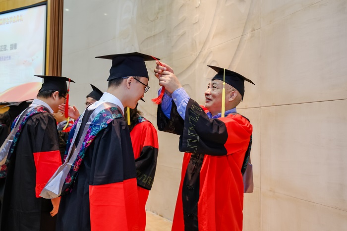 典礼随后推向高潮,学位分委员会代表为全体2023届毕业生,以及2020-2022届毕业生正冠、拨穗并颁授毕业证书,帽穗从右侧拨至左侧,标志着同学们顺利完成学业,即将踏上新的征程。