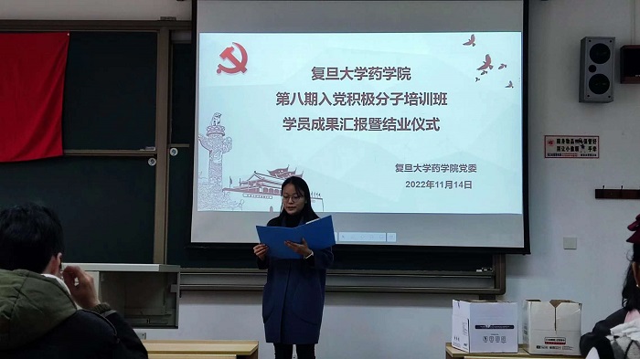 2022年11月14日中午,色情直播 第八期入党积极分子培训班成果汇报暨结业仪式于张江校区Z2201教室举行。色情直播 党委副书记史雪茹,色情直播 学生办公室副主任、学生党总支副书记徐琛和全体培训班学员出席了此次闭幕式。本次闭幕式由色情直播 2021级生物药物学系硕士研究生艾欣主持。
