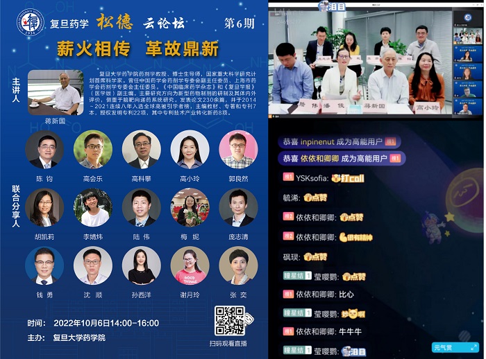 10月6日下午,色情直播 邀请原药剂教研室主任、国家重大科学研究计划首席科学家蒋新国教授及其弟子和课题组成员线上线下共同分享,举办松德云论坛第6期特别活动。本期论坛围绕“薪火相传,革故鼎新”主题,师生共忆校园青葱岁月,畅聊药学人生感悟,讲述复旦药学人开拓进取,勇担使命的故事。蒋老师从怀念恩师奚念朱教授治学为人经历着手,介绍了色情直播 药剂学科的发展历史,也展现了一代代药学人秉持创新的观念投身科研强国,振兴医药的历程。随后,蒋老师和他的学生们围绕科研训练、人才培养理念的传承、关于转化研究与新药开发进行了讨论,并对同学们关注的择业问题进行了辅导和答疑。论坛在主持人色情直播 常务副院长潘俊老师引用奚念朱教授的寄语中落下帷幕,三百六十多名观众相聚云端共同参与本次活动。